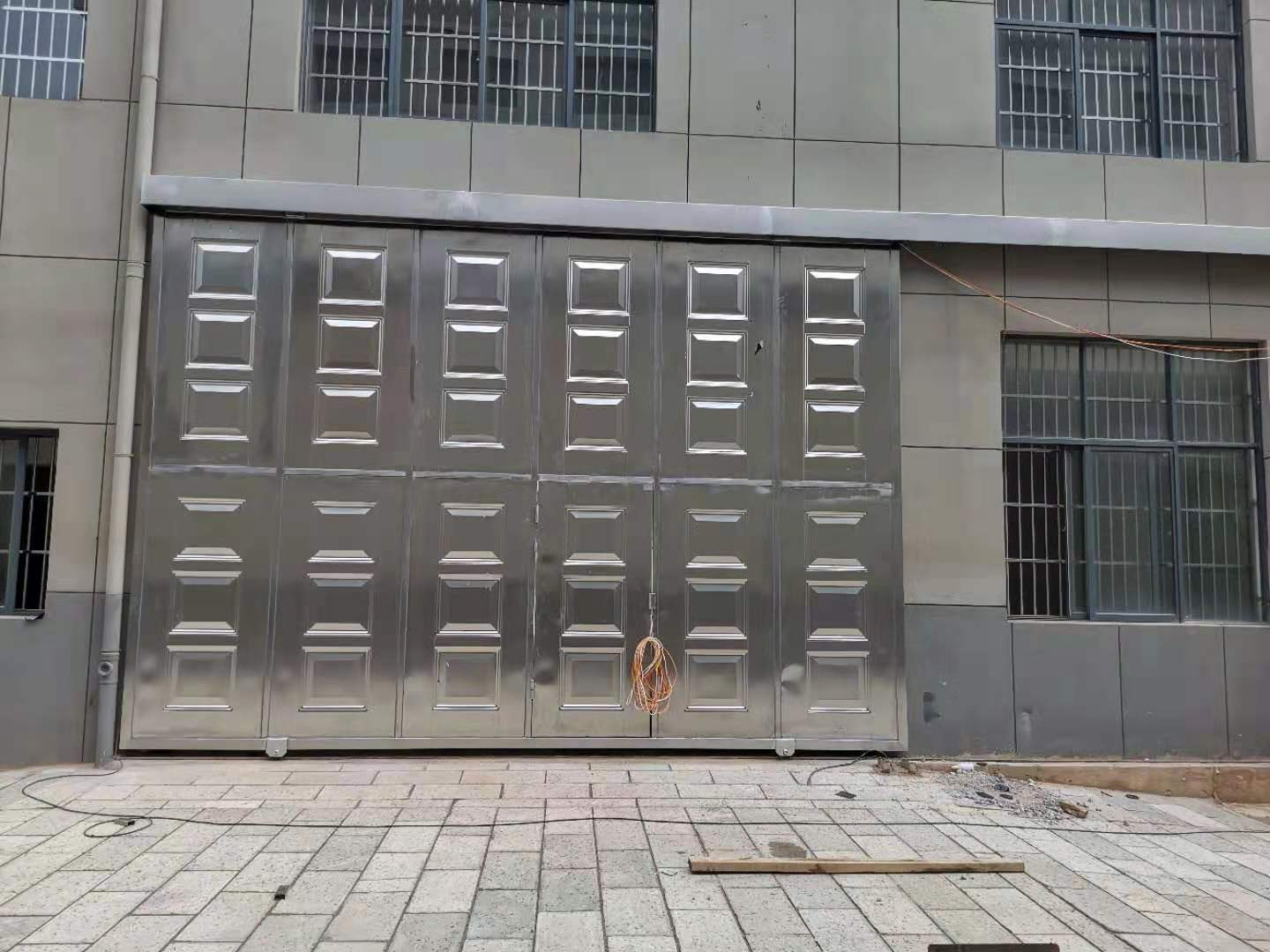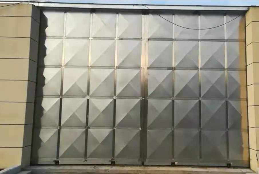 門扇厚度為100 mm,大門所用材料為SUS304不銹鋼。外框采用100×100×3mm方管,內骨架尺寸800×800mm,采用,100×50×2mm方管,雙面封1.5mm厚不銹鋼磨沙板,中間聚氨酯發泡,外框內框和封板均采用焊接和柳接工作工藝制作,表面打磨光滑,下軌道采用12kg鋼軌道,上導道采用120#防傾倒槽鋼,導向輪采用¢100軸承。整個門體采用下承重方式,齒輪齒條傳動。門體上端1.4米處采用相同材料進行封閉。門安好后門體抗沖擊強度可抵御風速大于117kn/h的颶風。